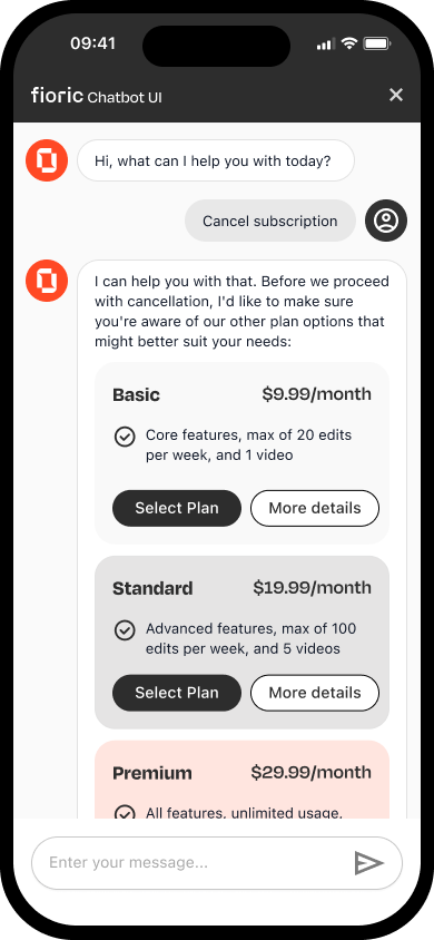 DialogFlow CX and Amazon Lex give you powerful AI bots using your data as foundation. Use Fioric to design your chatbot interfaces, to give your users a better AI chatbot engagement and experience.