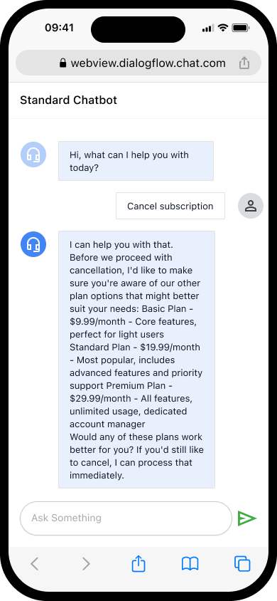 Plug into DialogFlow CX, Amazon Lex, OpenAI, or any chatbot platform. Your backend, our UI layer.